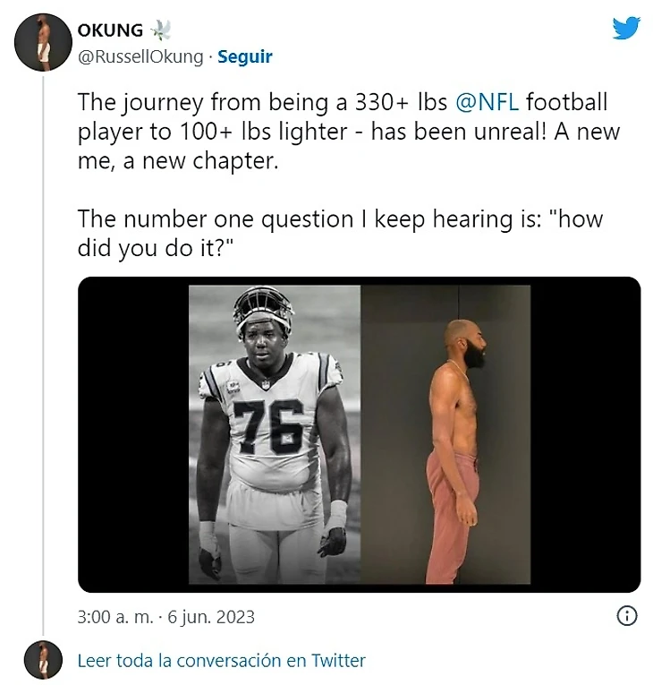 Бывший атакующий игрок НФЛ Рассел Окунг поделился в социальных сетях своей физической трансформацией. Он весил более 140 кг и потерял больше 40 кг. Как ему это удалось – все просто... Он не ел 40 дней!