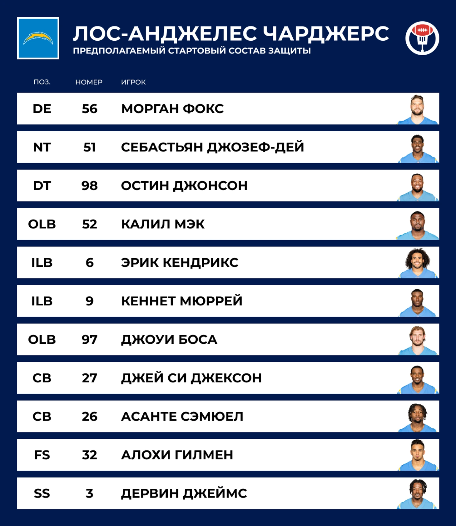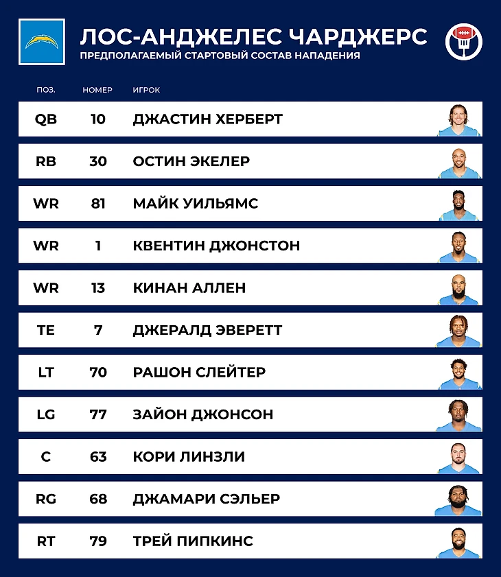 ⏪ Прошлый год: 10–7. Первый с 2018 года выход в плей-офф был подпорчен феерическим поражением в раунде уайлд-кард. «Чарджерс» во второй четверти игры с «Джексонвиллем» вели со счётом 27–0, но умудрились проиграть 30–31.