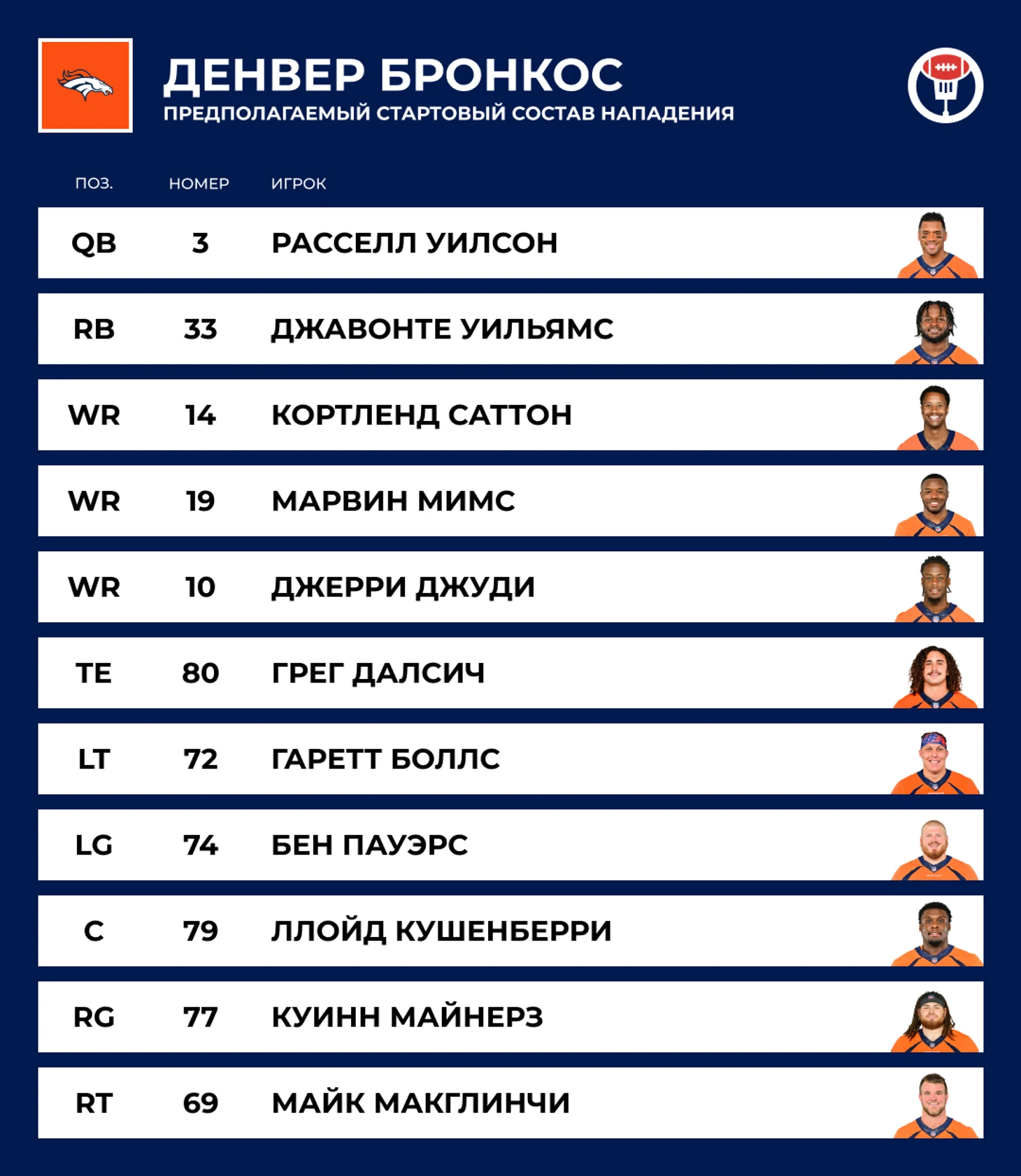 🎯 QB: Расселл Уилсон. Провёл 10 лет в «Сиэтле», считался элитным квотербеком, пасовый рейтинг в 7 сезонах улетал за сотку. Чемпион Супербоула. Из-за странных вывертов эго хотел больше тащить нападение на себе (мем «Let Russ cook»). В итоге дотащился до ухода из клуба, а в новом с разбегу регрессировал до одного из худших QB в лиге. Всё прошлое межсезонье накачивал общественность кэтч-фразой «Broncos Country, let's ride!», в итоге её припоминали весь сезон.