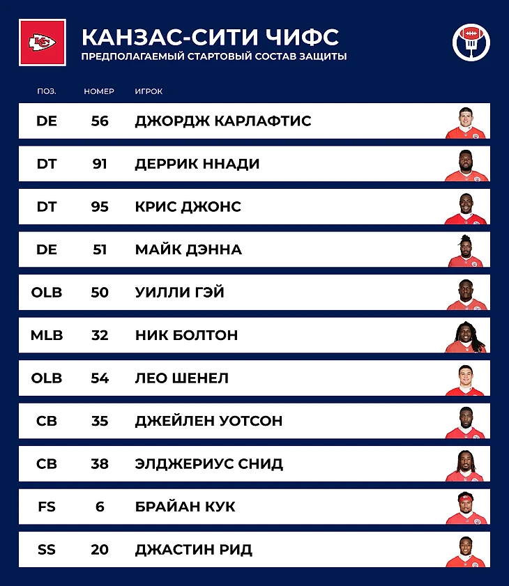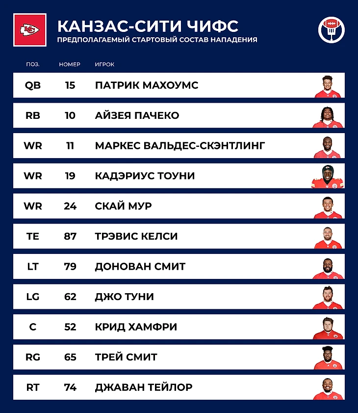 🃏 Козырь: Патрик Махоумс. Кажется, нападение «Чифс» будет эффективным, даже если вместо ресиверов на поле выйдут бол-бои. Махоумс уже доказал, что может стать MVP и выиграть Супербоул без ресивера №1 (хотя у него оставался Келси) и на одной ноге. Пока он на поле, у «Чифс» есть шанс в любом матче.