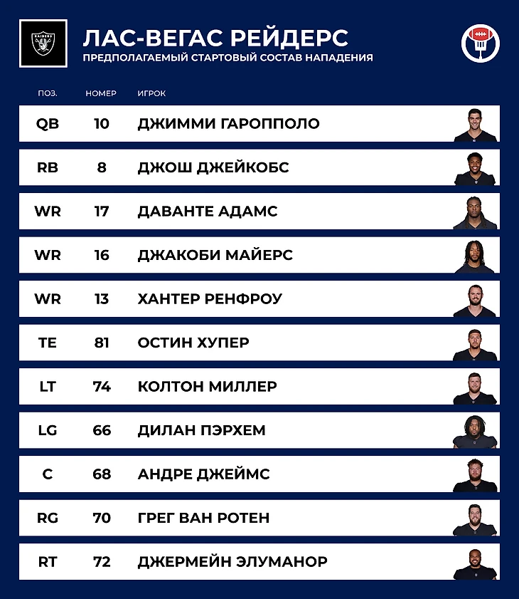 👋 Потеря: QB Дерек Карр. В целом, Карр — это средний класс квотербеков в НФЛ. Его потеря была бы оправдана, если бы на смену пришёл суперталант с драфта или Аарон Роджерс. Но замена Карра на Гаропполо это в лучше случае не потерять в качестве. А так Дерек был долгоиграющим лидером клуба.