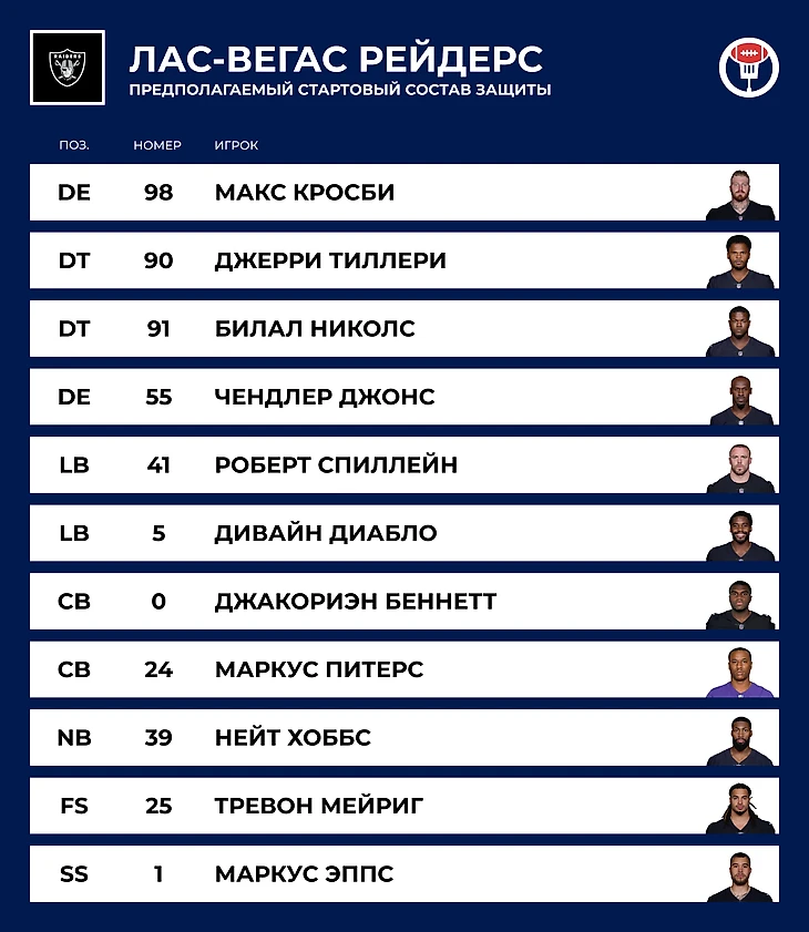 🦶 Слабость: Пас-раш. Линию нападения хотя бы укрепили, а вот с давлением на чужих квотербеков серьёзных прорывов не ожидается. В прошлом году прилично смотрелся разве что Рэнди Грегори, но он отыграл лишь 114 снэпов на пас-раше. Был подписан Зак Аллен, но этого маловато.