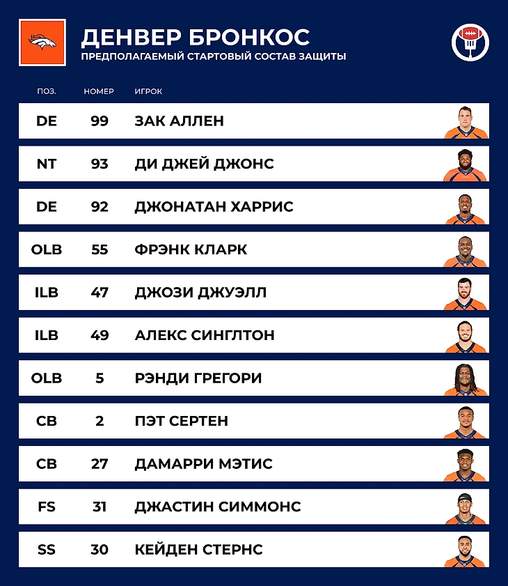 👔 Тренер: Шон Пейтон. С 2006-го по 2021-й (с годичным перерывом на дисквалификацию) был главным в «Нью-Орлеан Сейнтс», где выиграл Супербоул и создал постоянного претендента на чемпионство вместе с квотербеком Дрю Бризом. Прошлый год отдыхал, а теперь пришёл спасать «Денвер». Мужик авторитетный, знающий, с прищуром.