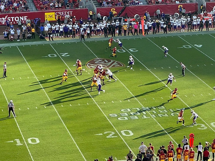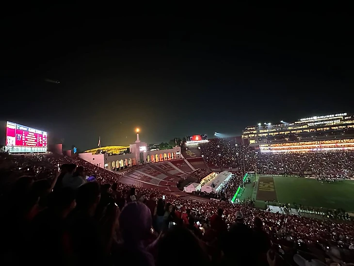 Имя квотербека Кейлеба Уильямса было на слуху, так что особого выбора не стояло — мы отправились на игру университета Южной Калифорнии. То посещение получилось ознакомительным и немного сумбурным, но главную цель выполнили — мерч закупили, опыт приобрели.
