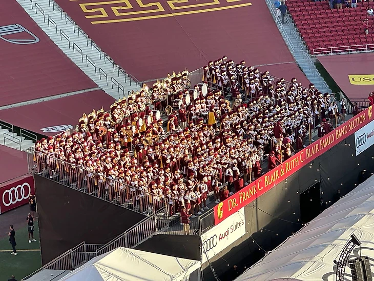В паузах поздравляли студентов USC, победивших в соревнованиях по другим видам спорта — университет большой, чемпионов много. Я ожидал большего в части чествования ветеранов, тут это популярно, а Veteran's Day уже в следующую пятницу — я бы не удивился, если бы это было центральной темой в перерывах, но по факту все ограничилось традиционным представлением одного связанного с вузом ветерана — показалось, что в августе эта процедура была даже поярче. Важное место отведено духовому оркестру – они играли центральную роль в хаф-тайм шоу, они же заполняли остальные паузы в игре.