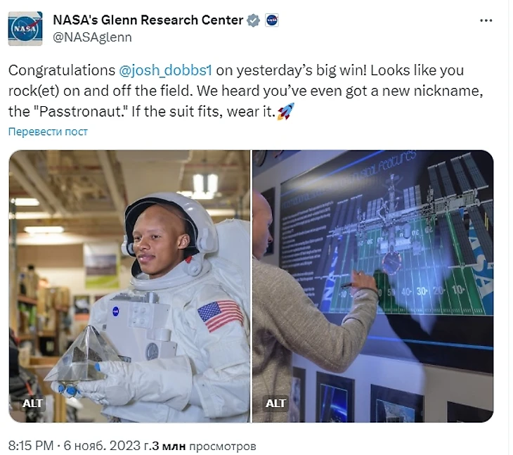 После победы над «Атлантой» аккаунт НАСА в твиттере поздравил Доббса, упомянув прозвище квотербека — «пастронавт».