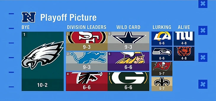 В НФК гораздо более чёткое разделение на топ-4 и всех остальных (включая «Фэлконс»). И тут есть вероятность, что после следующего тура сразу у четырёх команд будет разница 10-3 - и особняком стоит пятый посев, который с большой вероятностью заберёт одна из команд с Востока. В ближайшее воскресенье они сыграют между собой в Арлингтоне - «Ковбойс» полны решимости взять реванш за обидное поражение в Филадельфии.