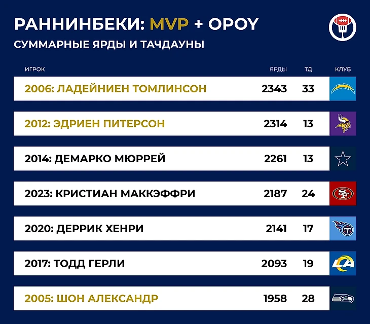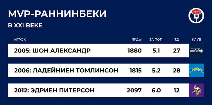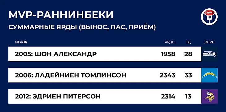 Полторы тысячи ярдов – много, но не заоблачно много. В прошлом сезоне столько набирали сразу три бегущих (Джош Джейкобс, Деррик Хенри, Ник Чабб). В позапрошлом Джонатан Тейлор набрал 1,811 ярдов, а в 2020-м Хенри и вовсе пробил две тысячи. Никто из них всерьез даже не претендовал на MVP. Кто же из раннинбеков и за что получал эту награду в XXI веке?