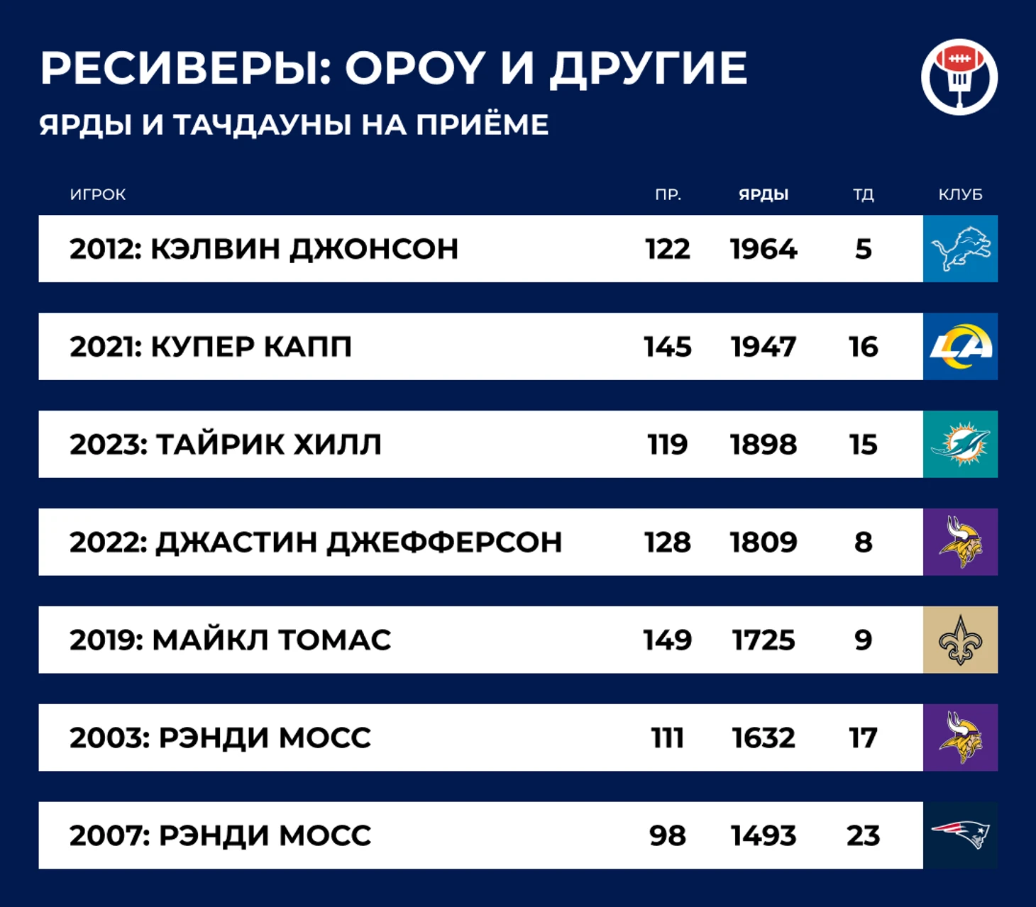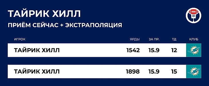 Две тысячи ярдов – это по 117.6 ярда за игру на протяжении 17 игровых недель. Хилл стартовал с 215 ярдов в игре с «Майами» и с тех пор держал темп вплоть до начала декабря (123,4 ярда за игру). В игре с «Теннесси» принимающий получил травму и пропустил следующий матч. Сейчас он выбился из графика и находится не в оптимальном состоянии. Для установления рекорда за 3 оставшихся матча нужно набрать 422 ярда, для достижения обозначенной цели – 458.