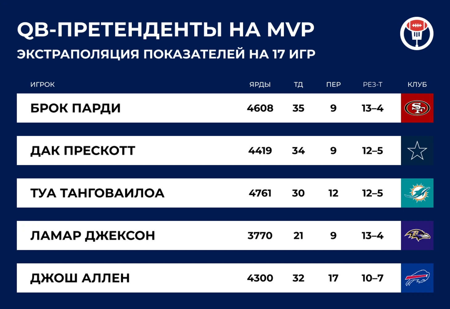 Месяц назад фаворитами считались Ламар Джексон («Балтимор») и Туа Танговаилоа («Майами»). В прошлую субботу лидерами букмекерских линий были Дак Прескотт («Даллас») и Брок Парди («Сан-Франциско»). После неудачной игры Прескотт отвалился, но нет ощущения, что ситуация обрела хоть какую-то ясность.