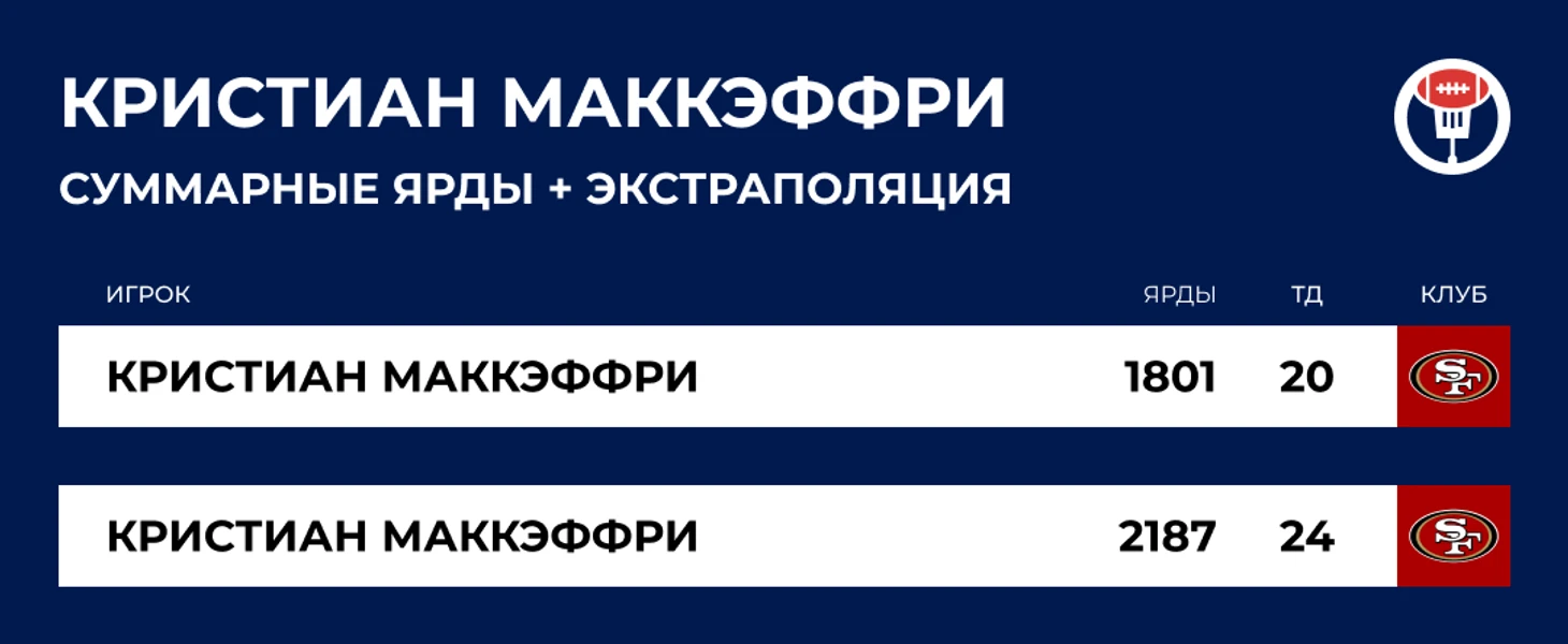 По ярдам на выносе Кристиан – лидер сезона, по тачдаунам на выносе занимает третье место. Давайте зафиксируем его сиюминутные показатели + посмотрим, как он должен закончить при сохранении среднего темпа набора показателей.