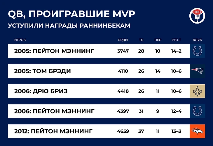 В 2005-м и 2006-м по два квотербека получили хоть какие-то голоса в гонке за MVP. В 2012-м конкуренцию Питерсону составил только Пейтон Мэннинг.