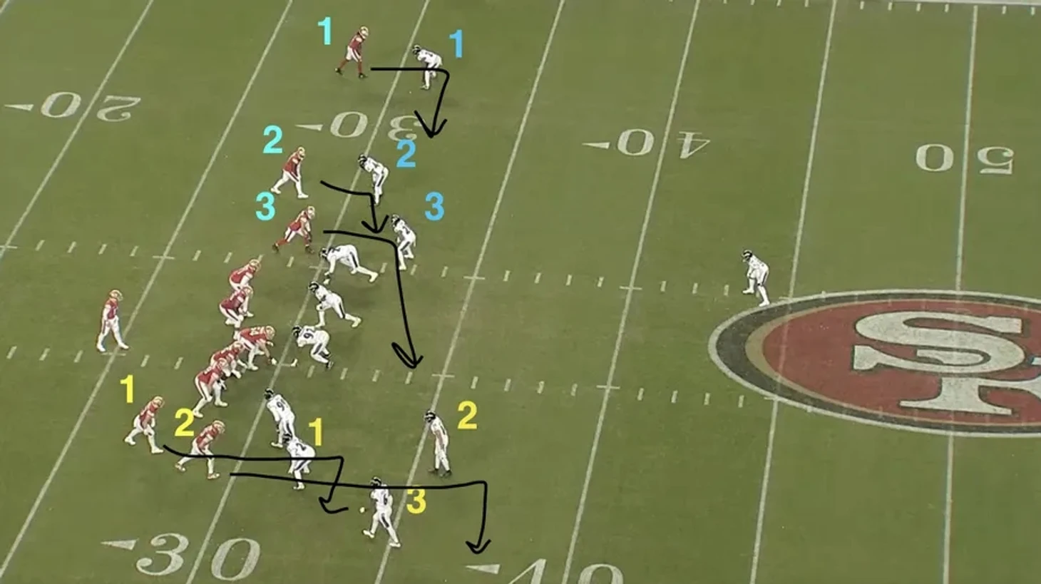 Перед вводом мяча в игру следует сперва читать сторону с 3 ресиверами. Оттуда Парди и начинает, продвигаясь от внутренней стороны к внешней. Уилли Снид располагается глубже всех, у него слэнт, и его прессуют в самом начале исполнения маршрута. Патрик Куин совершенно свободно бежит на Парди с правой стороны. Логичное развитие розыгрыша: переходи к следующему ресиверу, Дибо Сэмюелу на слэнте, тем более, что он сразу же обыгрывает защитника.