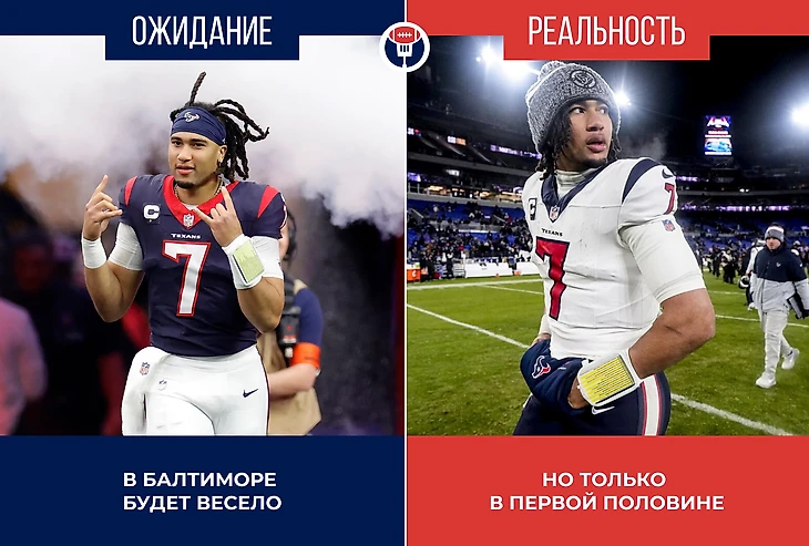 На перерыв «Балтимор» и «Хьюстон» ушли при равном счёте 10–10. Квотербек домашней команды Ламар Джексон позже признался, что в перерыве много ругался. Помогло. Во второй половине заносили только «Рейвенс» — 24 безответных очка.
