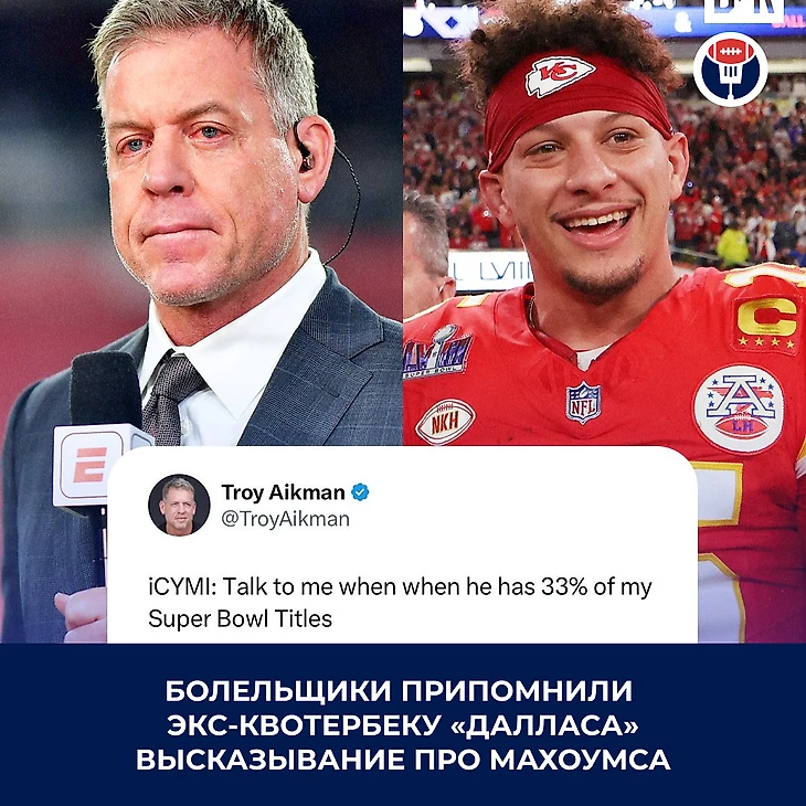 Интернет всё помнит. После победы «Чифс» в Супербоуле внезапно целый ряд приветов в соцсетях получил... Трой Эйкмен, бывший квотербек «Даллас Каубойс», последние 20 лет работающий в качестве комментатора.