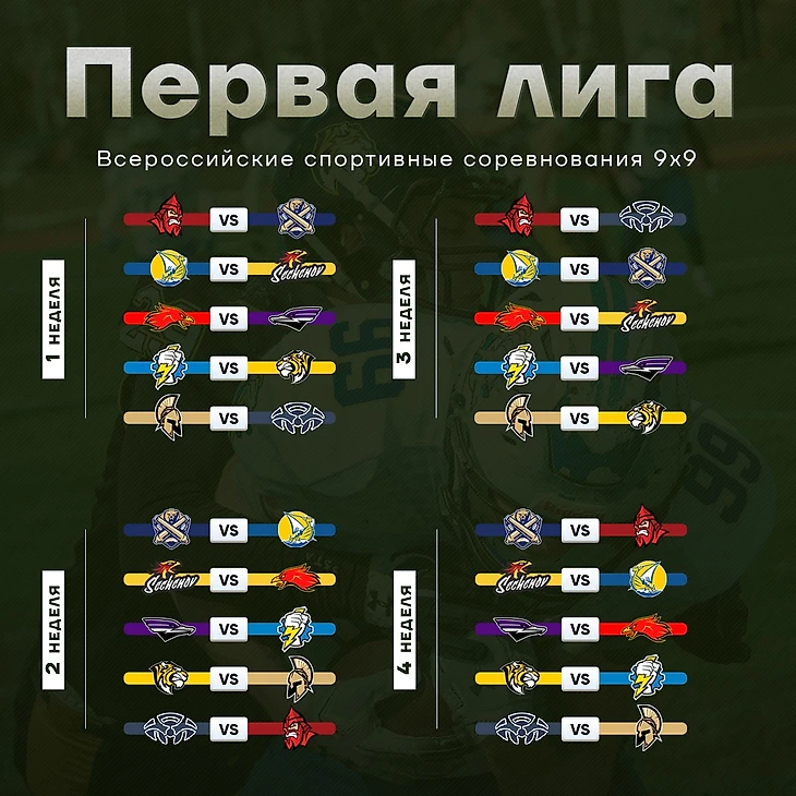 Викинги (Вологда) - постоянные участники Первой Лиги. Прошлый сезон закончили со статистикой 1-3 и не прошли в Плей-Офф Витязь (Подольск) - бронзовые призёры Чемпионата России 2016. Несколько лет постоянные участники Первой Лиги. Прошлый год также, как и Викинги, закончили со статистикой 1-3 Киборги (Обнинск) - С 2020 по 2022 год, играли в Первой и Второй Лиге. Последний раз играли два года назад во Второй Лиге и закончили сезон 0-6. Оружейники (Петрозаводск) - победители Второй Лиги 2021. В 2022 году- полуфиналисты Первой Лиги. В прошлом сезоне уступили в Четвертьфинале Второй Лиги Сеченов Феникс (Москва) - команда представляющий Московский Сеченовский университет. Постоянный участник Второй Лиги. Прошлый сезон закончили 0-6 Спартанцы 2 (Москва) - дублирующий состав действующих Чемпионов России. Вторая команда уже два года участвует во Второй Лиги. Прошлый год закончили победой в турнире Стальные Тигры (Пермь) - серебряные призёры Чемпионата России 2020 года. Последние два сезона выходили в финал Первой Лиги и со второй попытки стали чемпионами. Стормбрингерс (Самара) - Чемпионы Первой Лиги 2021. В 2022 году, пошли на понижение и выиграли Вторую Лигу. Прошлый сезон провели во Второй Лиге, где уступили в четвертьфинале Новороссийским Адмиралам Уральские Молнии (Екатеринбург) - четвертьфиналисты Чемпионата России 2015. Долгое время была одна из сильнейших команд на Урале. Прошлый сезон провели в Первой Лиге, закончив его без единой победы Фениксы (Пенза) - Полуфиналисты Второй Лиги 2021. Постоянные участники Второй Лиги. Прошлый сезон закончили со статистикой 3-3 и остановились в шаге от плэй - офф