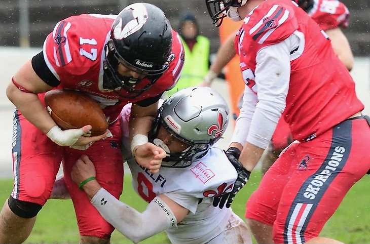 Будем честны, в плане зрелищности игра получилась не очень, но начало второго отрезка (по крайней мере его начало) все изменило. Половина началась с драйва Scorpions, Райан Гриффин решает отдать мяч раннинбеку. Ресивер Мартино Пиаззи, видя это, решает играть блокирующую роль, но решать остановить не Марко Фанни, набегающего на 27 номера Варесе, а ди-бека, поэтому Дайлан смог набрать чуть больше одного ярда. После варесцы исполнили вкладку, которая тоже продлилась не долго. Началась третья попытка и квотербек решает пасовать! Из 5 игроков, стоящих на приеме, у Гриффина есть только 2 варианта, которые не находятся под сильным прессингом — раннинбек, находящийся чуть дальше своей линии, и Мартино Пиаззи, пробирающийся сквозь защитников гостей. Смотря на прошлые пасы вареского QB, можно сказать, что Райан Гриффин принял рисковое решение, но оно сработало. Ресивер с легкостью поймал мяч и остановить его получилось только у зачетки.