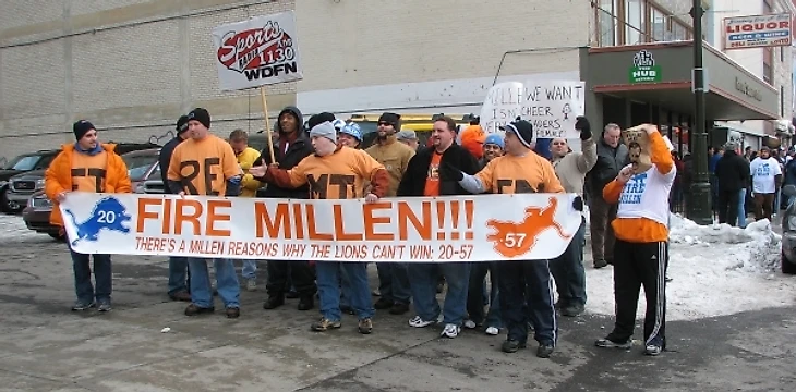 Но это будет герой уже другой эпохи. Болельщики «Детройта» требовали отставки Миллена с 2005 года — соответствующие кричалки регулярно раздавались на спортивных матчах в штате Мичиган. Напротив, болельщики «Пэкерс», «Вайкингс» и «Беарс» издевательски светили плакатами «Оставьте Миллена».