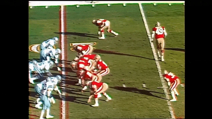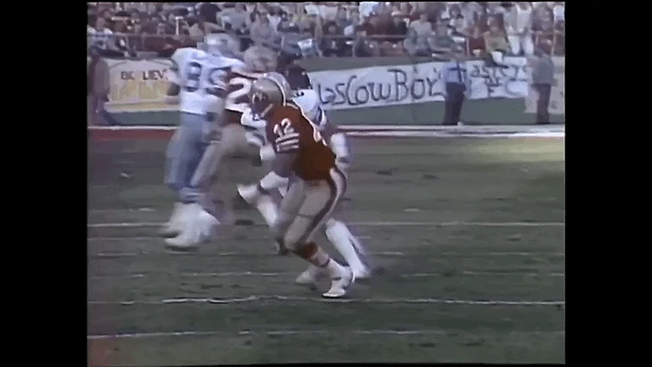 И начали матч они соответствующе: калифорнийская команда сразу же оформила своим друзьям из Техаса 3-и-аут, выпустив Монтану на поле. Джо делал то же самое, что и весь сезон, хотя сложно сказать, что это было легко: агрессивный пас-раш «Далласа» постоянно давил на #16, заставляя того периодически выкатываться из конверта и делать броски в движении. И нужно признать – Джо был хорош. В течение драйва он ни разу не попал под сэк, а комплиты на Янга и Эллиота органично перетекали друг в друга. Как итог – быстрая передача на Соломона, который скинул тэкл ди-бэка «Каубойс» и превратил розыгрыш в 8-ярдовый тачдаун. «Даллас» ответил довольно быстро: сначала 20-ярдовая передача Уайта дала «Ковбоям» возможность для филд-гола, а после того, как бегущий «Найнерс» Билл Ринг уронил мяч недалеко от собственной рэдзоун, всё тот же Дэнни Уайт подвесил мяч в область зачетки «49-х». К концу первой четверти «Команда Америки» имела преимущество в 3 очка.