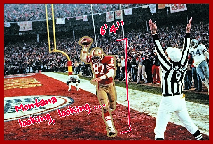 Стадион «Кэндлстик» рыдает в экстазе – светлое будущее только что наступило. Увидеть такой розыгрыш получается не так уж часто, а если добавить сюда контекст камбэка, гипотетическую победу над главным историческим оппонентом и возможный выход в Супербоул, то болельщики вели себя вполне ещё сдержано. Абсолютно все сходили с ума, в том числе и Томас Брэди старший, пришедший на игру со своим 4-х летним сыном, которому способность возвращаться, видимо, передалась от Джо воздушно-капельным путём. Но «золотым» ещё предстояло забить реализацию, чтобы выйти вперед, а потом отзащищаться против «Ковбоев» – как-никак, а у прошлогодних финалистов ещё оставалась 51 секунда. Чуда не произошло: Рэй Вершинг забил, а после комплита на 31 ярд квотербэк гостей, Дэнни Уайт, получает сэк, роняя при этом мяч. В середине поля Монтана становится на колено в победной формации – они отправляются в первый в своей истории Супербоул.