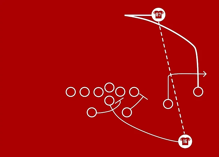 Концепция довольно простая: Соломон выполняет быстрый аут-маршрут, он – первая опция. После приема Фредди либо выбегает в аут сразу после набора первого дауна, чтобы остановить время, либо разворачивается и забегает в тачдаун. Расположенный рядом с ним Кларк – опция №2. Он делает «пик», то есть мешает движению защитника на Соломона, после этого делает плавную дугу влево под заднюю линию зачетки и резко меняет направление движения, смещаясь параллельно с Монтаной. Сам Джо с самого начала розыгрыша движется в правую сторону, а наличие 8 блокировщиков должно создать ему достаточно пространства для быстрого паса. Эта простая комбинация, и она вполне безопасна. Правильно?