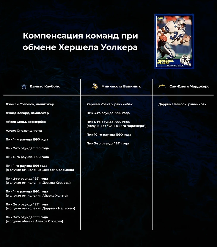 Хершел Уокер – это обладатель Хайсман Трофи-1982, бывшая звезда команды «Нью-Джерси Дженералс», экс-лучший бегущий ЮСФЛ, и, по состоянию на начало 1989-го, действующая звезда НФЛ и «Даллас Каубойс», 2-кратный пробоулер и член Second-team All-Pro, который только что пробил 1500 ярдов на выносе и суммарные 2000 ярдов от линии скриммеджа.