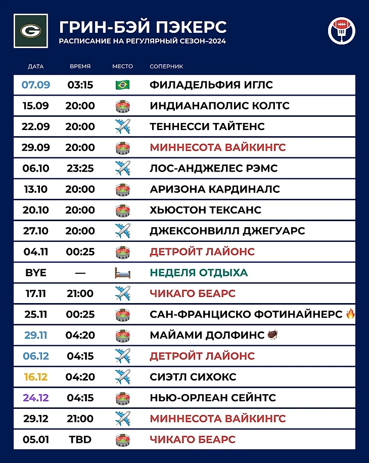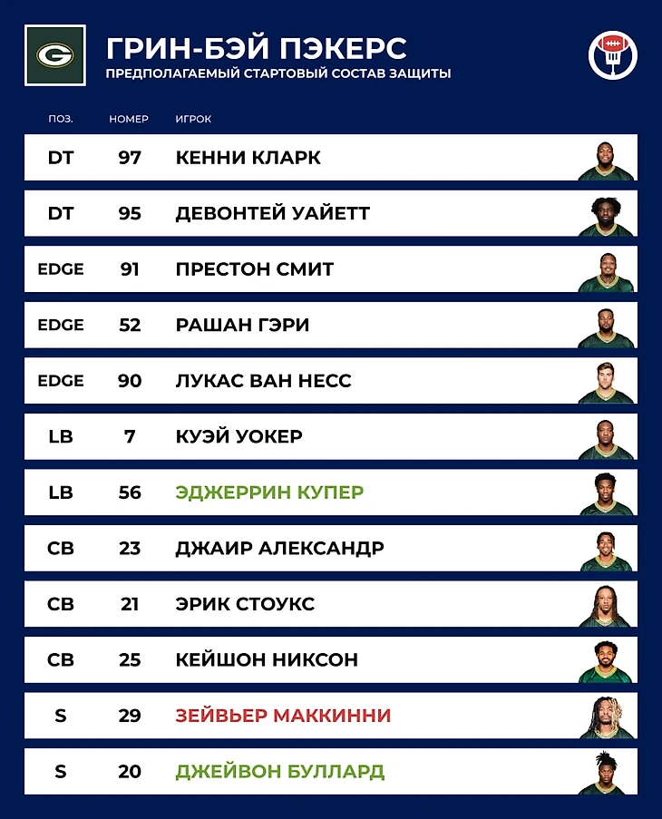 🦶 Слабость: Вся остальная защита. Несмотря на хороший результат, «Пэкерс» уволили координатора Джо Бэрри, потому что команда проваливалась по остановке выноса, да и с игрой в прикрытии было не всё ладно. Ремонт корпуса ди-беков и особенно лайнбекеров — приоритетная задача на предсезонку.