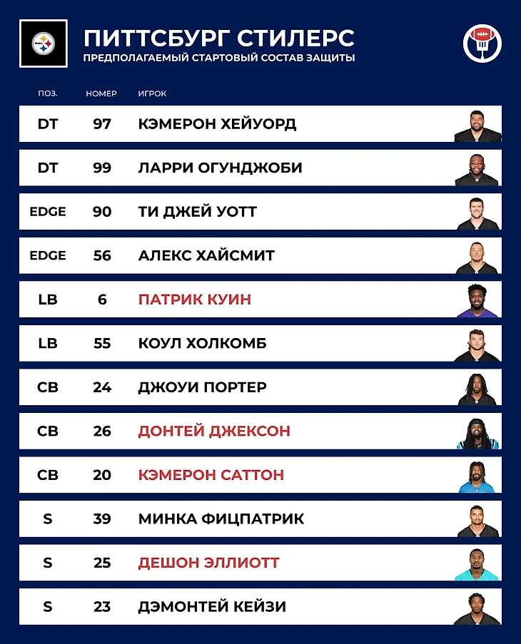 👔 Тренер: Майк Томлин. Один из самых «долгоиграющих» специалистов в лиге — работает со «Стилерс» с 2007 года. Мастер по работе с защитой, двойник актёра Омара Эппса. Поскольку не выигрывал в плей-офф вот уже 7 лет, ходят разговоры о том, что «уже не тот». Но при нём «Питтсбург» не знает, что такое «поражений больше, чем побед».