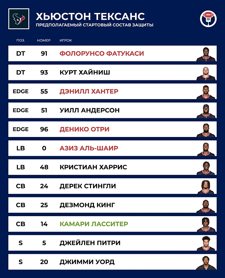 🤝 Находка: DE Дэнилл Хантер. Ещё одно большое приобретение «Тексанс» — 29-летний пас-рашер из «Миннесоты». За сезоны 2020–2021 сыграл всего 7 матчей, тогда были серьёзные опасения, что карьера загибается, но последние два года провёл от звонка до звонка. В прошлом сезоне поставил личный рекорд по сэкам (16.5).
