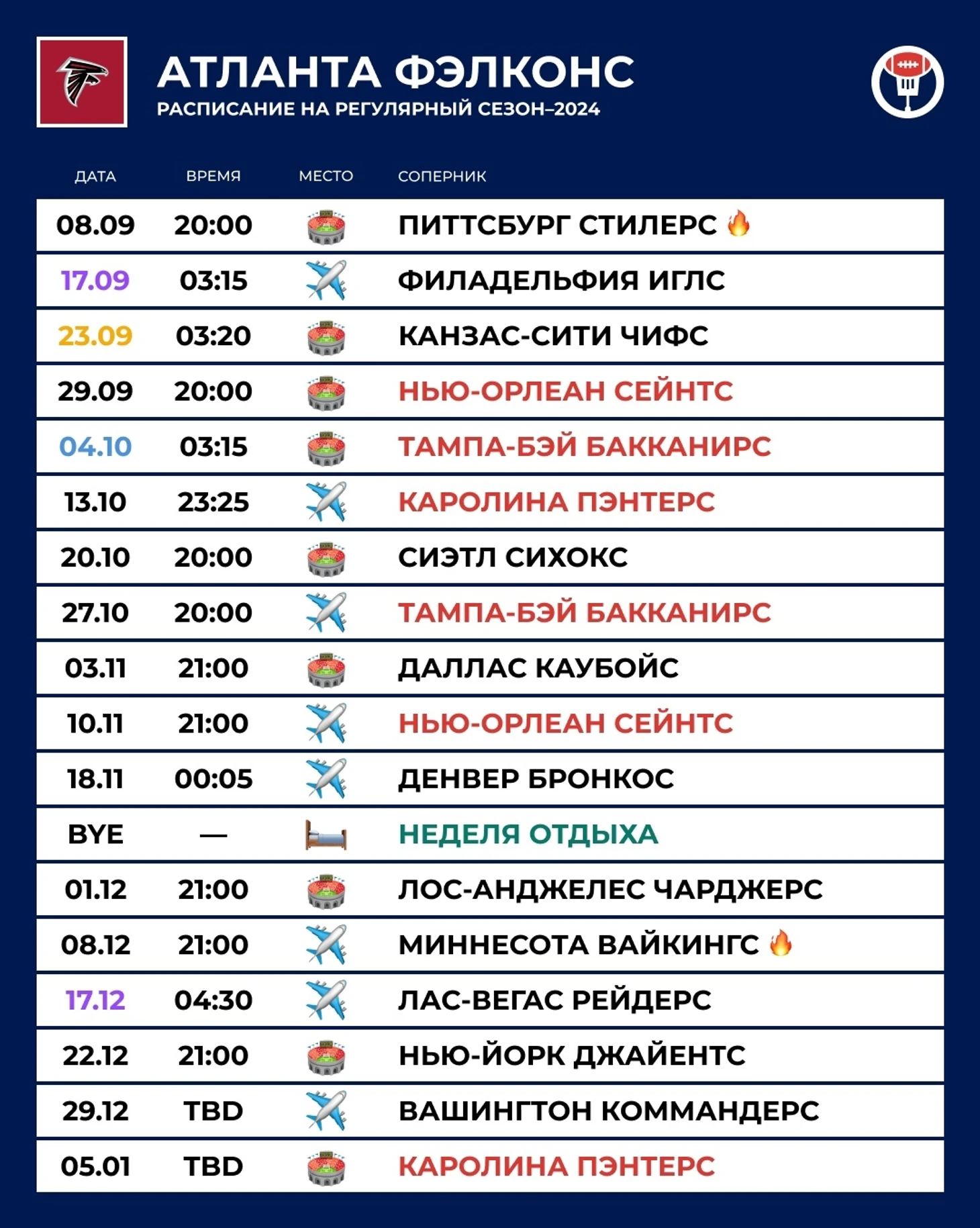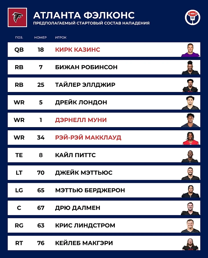 🎯 QB: Кирк Казинс. С одной стороны, практически всю карьеру играл выше среднего уровня среди квотербеков, а в прошлом сезоне и вовсе показывал лучший футбол. С другой, к 35 годам выиграл один матч в плей-офф и приходит после травмы ахилла с огромным контрактом. «Атланта» уверена, что только квотербека ей не хватает для успеха хотя бы в дивизионе. С тем, что это апгрейд по сравнению с Риддером, не поспоришь.