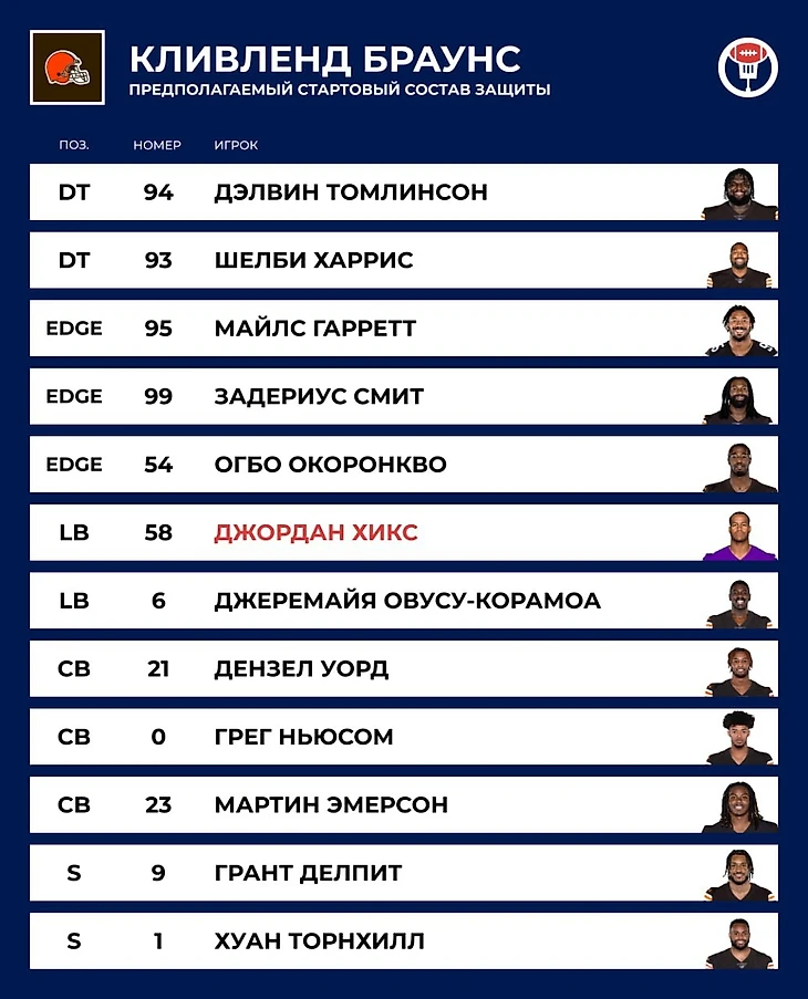 🃏 Козырь: Защита. Каждая составляющая — восторг. За давление отвечает не только Майлс Гарретт, но и Задериус Смит, Овусу-Корамоа и Окоронкво. В корнербеках глубина не менее впечатляющая — по отдельности каждый из троицы Дензел Уорд, Грег Ньюсом и Мартин Эмерсон считался бы №1 во многих командах. И главное, никуда не ушёл координатор защиты Джим Шварц.