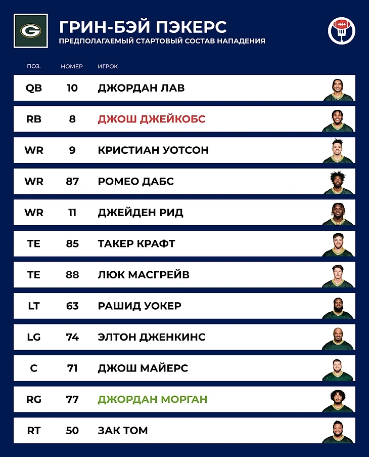 🎯 QB: Джордан Лав. Был выбран в конце 1-го раунда драфта–2020 и три года провёл в чулане, как когда-то и сам Роджерс. Дебютный сезон в старте разделился на первую часть «потенциал есть, но очень неровно» (14 тд, 10 перехватов) и вторую часть «all you need is Love» (18 тд, 1 перехват). Вторая часть случилась в очень удачный для квотербека момент — в это межсезонье он подписал контракт на $220 млн, войдя в тройку самых высокооплачиваемых.