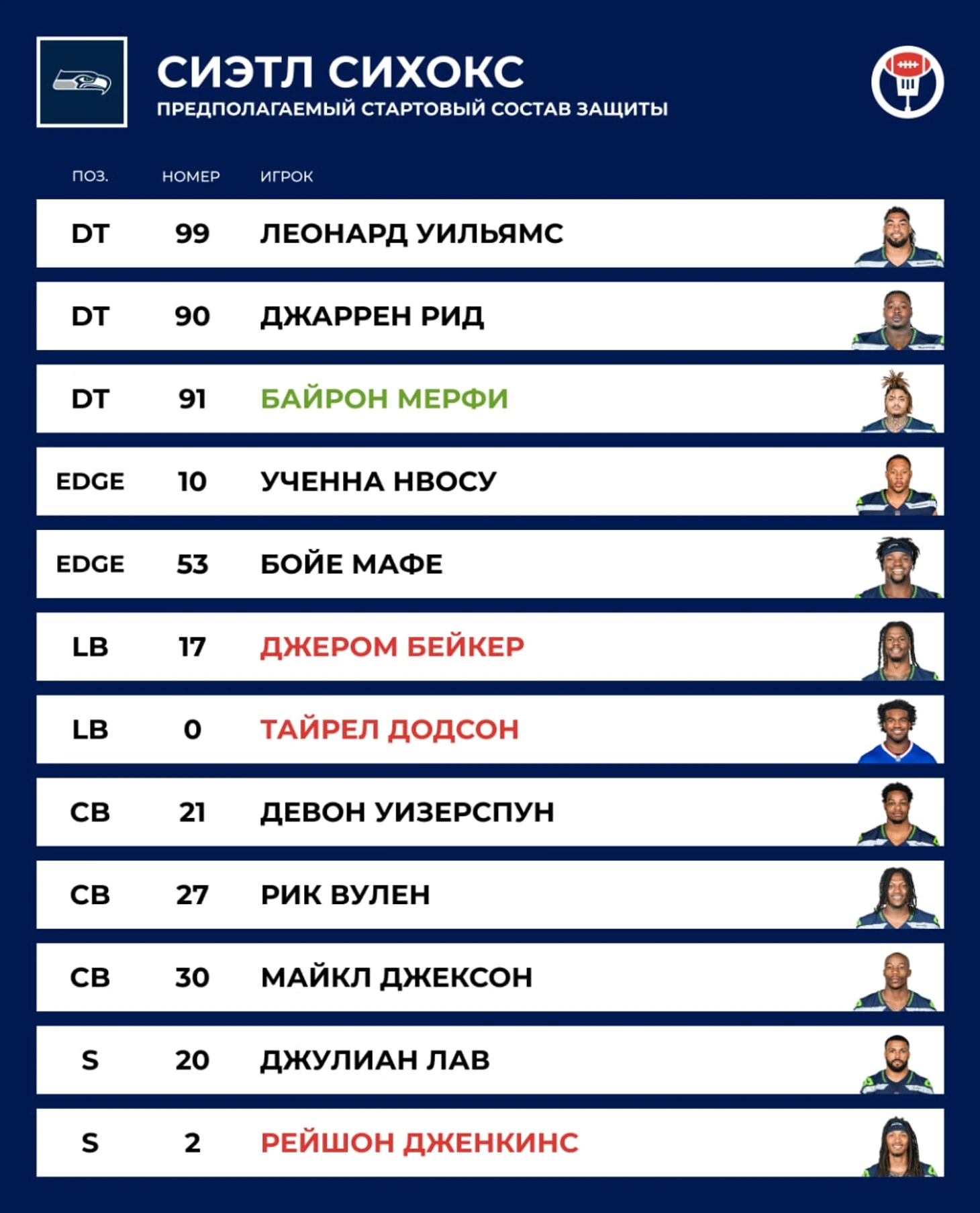 🤝 Находка: DT Байрон Мерфи. «Сихокс» здорово укрепили центральное звено линии защиты, выдав крупный контракт Леонарду Уильямсу и выбрав в первом раунде драфта Байрона Мерфи из университета Техаса. Таскать через центр против «Сиэтла» будет очень сложно. При этом эффективность пас-раша по краям вызывает вопросы.