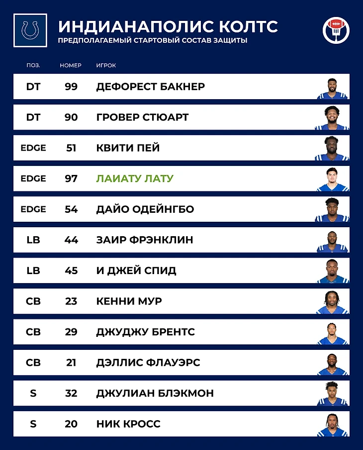 🃏 Козырь: Линия защиты. Дефорест Бакнер — один из лучших внутренних линейных защиты в НФЛ, на подмоге у него недооценённый игрок против выноса Гровер Стюарт + большая глубина во всём юните. По краям есть кому атаковать квотербеков даже с учётом потери Эбукэма — Квити Пей прогрессирует с каждым годом, появился Лату.