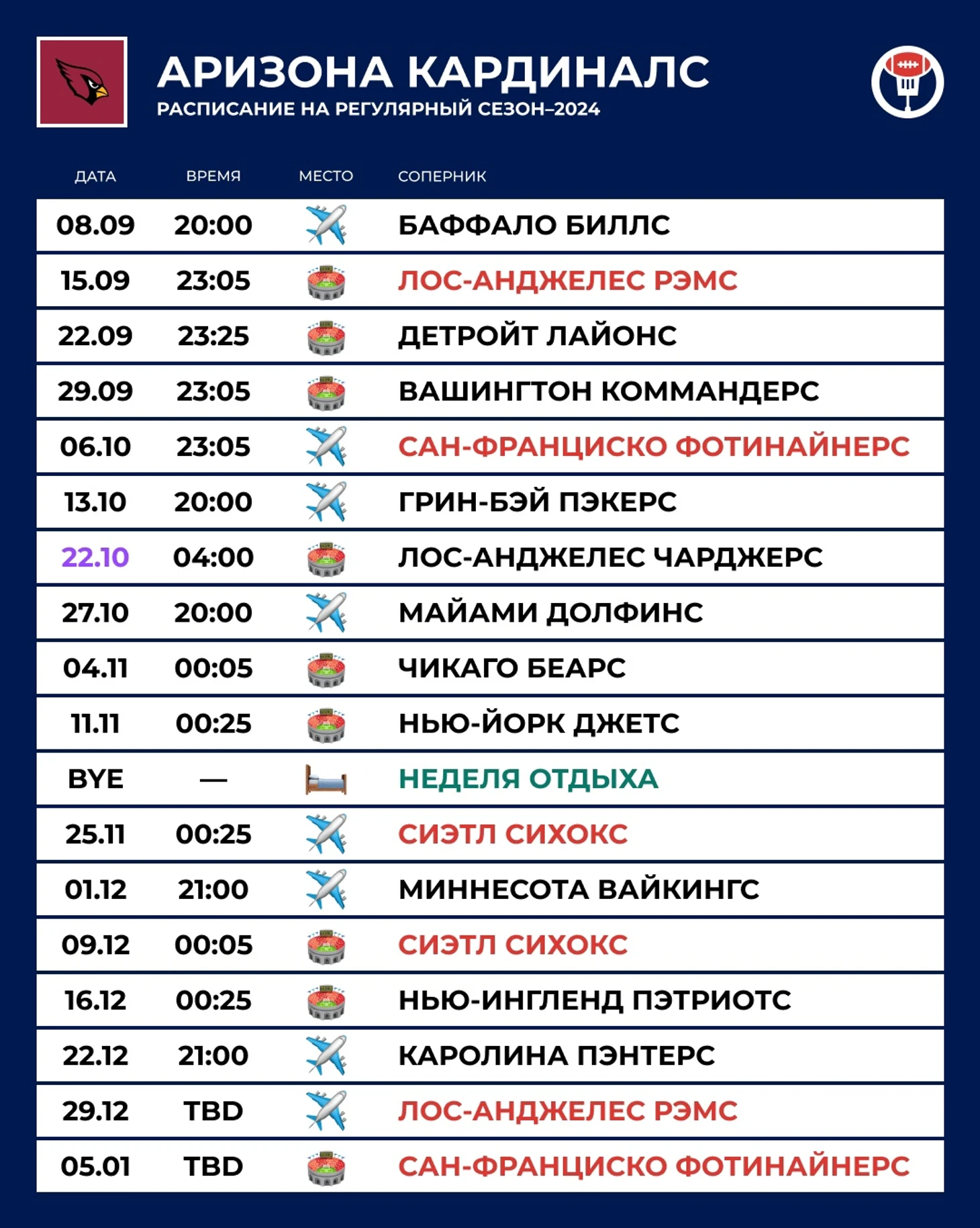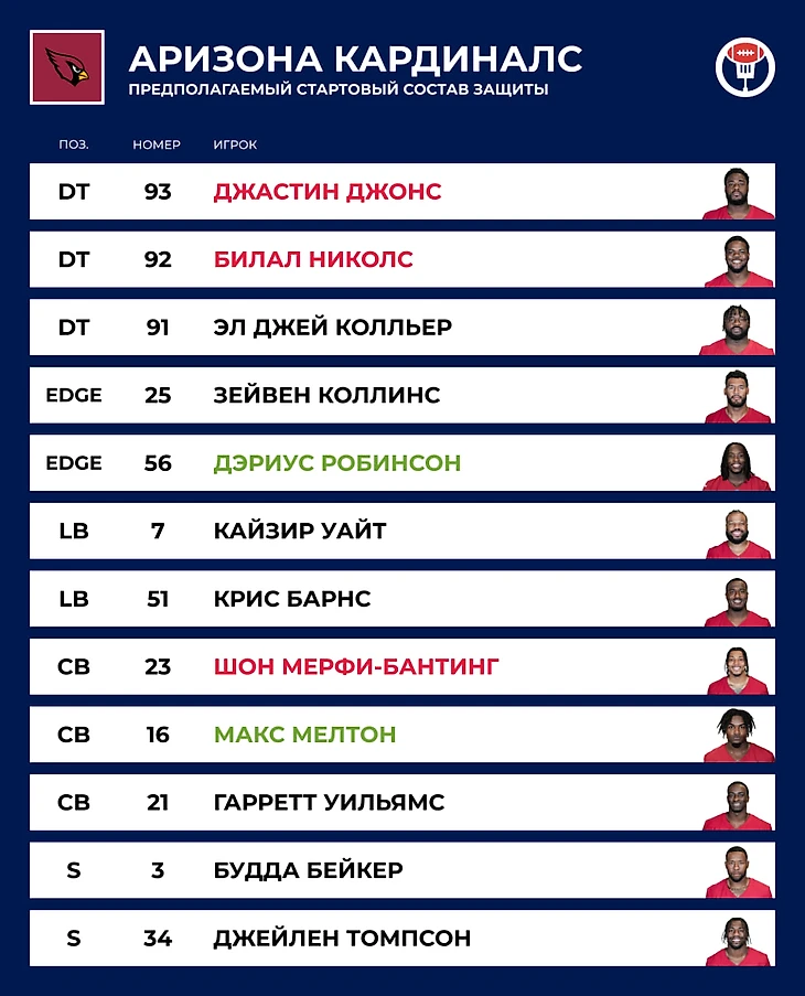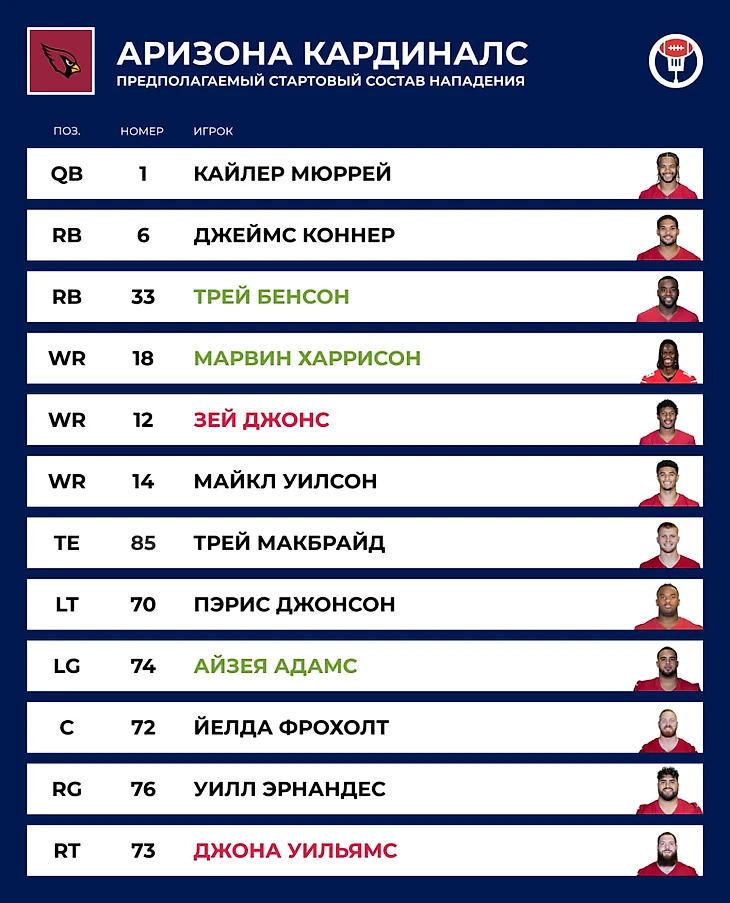 ⏪ Прошлый год: 4–13. Первый этап перестройки: новый тренер, новый генменеджер, без большой звезды в нападении Деандре Хопкинса и полсезона без травмированного стартового квотербека. Результат мог быть и получше, если учесть, что из 7 матчей, завершившихся с разницей в одно владение, «Кардиналс» выиграли только 2.