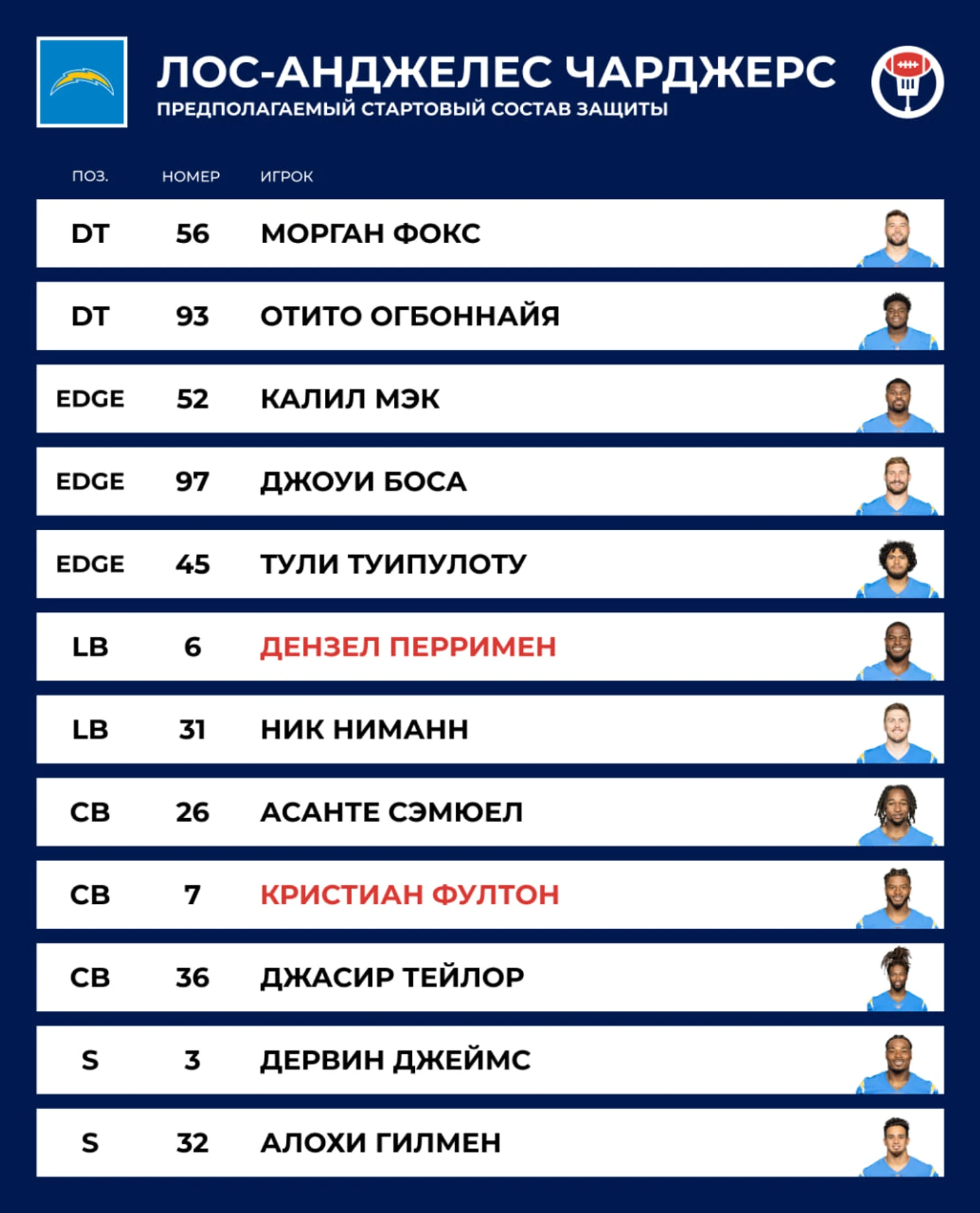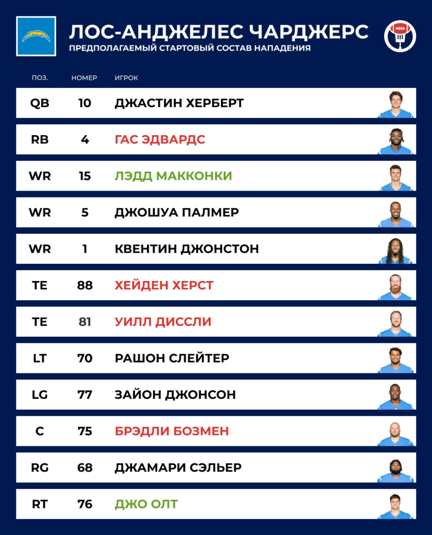 👋 Потеря: WR Кинан Аллен. Новому руководству «Чарджерс» в наследство досталась очень тяжёлая ситуация с раздутой платёжкой. Стало очевидно, что придётся расстаться с кем-то из лидеров. Харбо решил, что лучше попытаться дёшево заменить ресиверов, чем Босу с Мэком, поэтому клуб покинули Аллен и Майк Уильямс. Херберт с прошлого года зарабатывает по $52.5 млн в год — пора лепить звёзд из любых ресиверов.