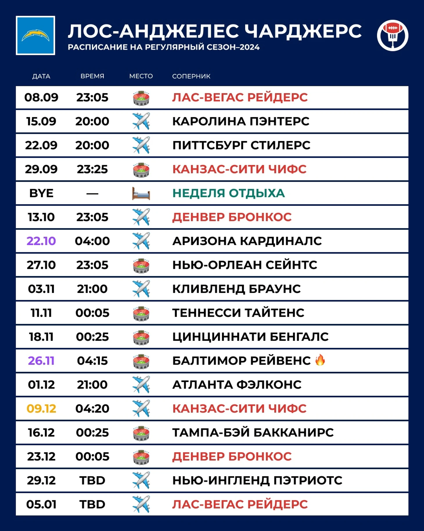 🦶 Слабость: Общая кадровая ситуация и карма. У «Чарджерс» были проблемы с выносом, и после ухода Остина Эклера Харбо-младший подтянул бывших раннинбеков Харбо-старшего — Гаса Эдвардса и Джей Кея Доббинса. Про ресиверов я уже сказал. Есть вопросы по гардам, ди-тэклам и лайнбекерам. А самое главное, Chargers gonna Charger. Даже если всё пойдёт хорошо, «Чарджерс» найдут способ проиграть матч/сезон. Команда такая.