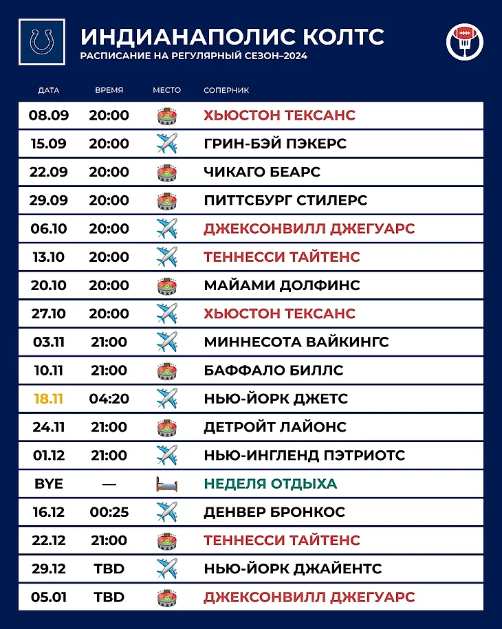 😌 Амбиции: Даже с учётом того, что «Хьюстон» после прошлого года стал фаворитом, а «Джегуарс», напротив, завалились в концовке, победа в дивизионе не выглядит для «Колтс» сверхзадачей. Скажем так, их прошлогодний скачок от 4–12–1 к 9–8 с дублёром на позиции квотербека — это куда впечатляюще, чем потенциальный шажок в плей-офф сейчас.