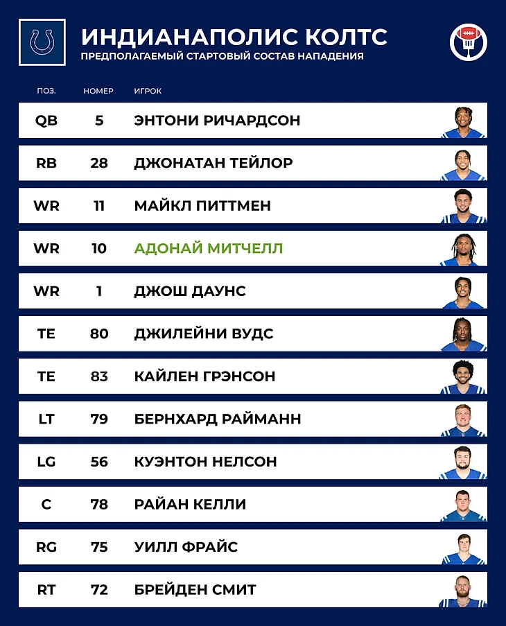⏪ Прошлый год: 9–8. Когда стало известно, что квотербек-новичок Энтони Ричардсон выбыл до конца сезона на 5-й неделе, многие решили, что про «Колтс» можно забыть. Однако команда с дублёром Гарднером Миншью финишировала с положительным балансом и упустила путёвку в плей-офф, проиграв в последнем туре «Хьюстону» в 4 очка.