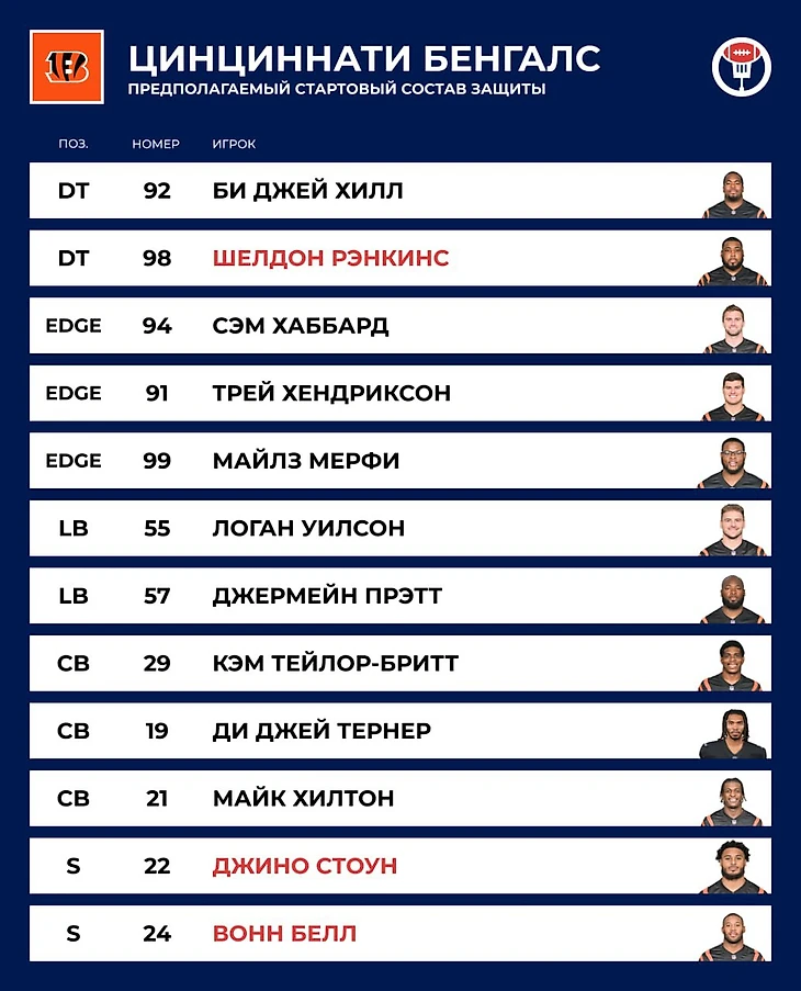 ⏪ Прошлый год: 9–8. На фоне недолеченной травмы Джо Бурроу «Бенгалс» очень тяжело стартовали, и к середине сезона держались на грани нулевого баланса, когда стартовый квотербек сломался окончательно. С дублёром Джейком Браунингом команда даже превзошла ожидания и оставалась в борьбе за плей-офф до конца. В итоге заняли последнее место в дивизионе с результатом, с которым другие команды выходят в плей-офф.