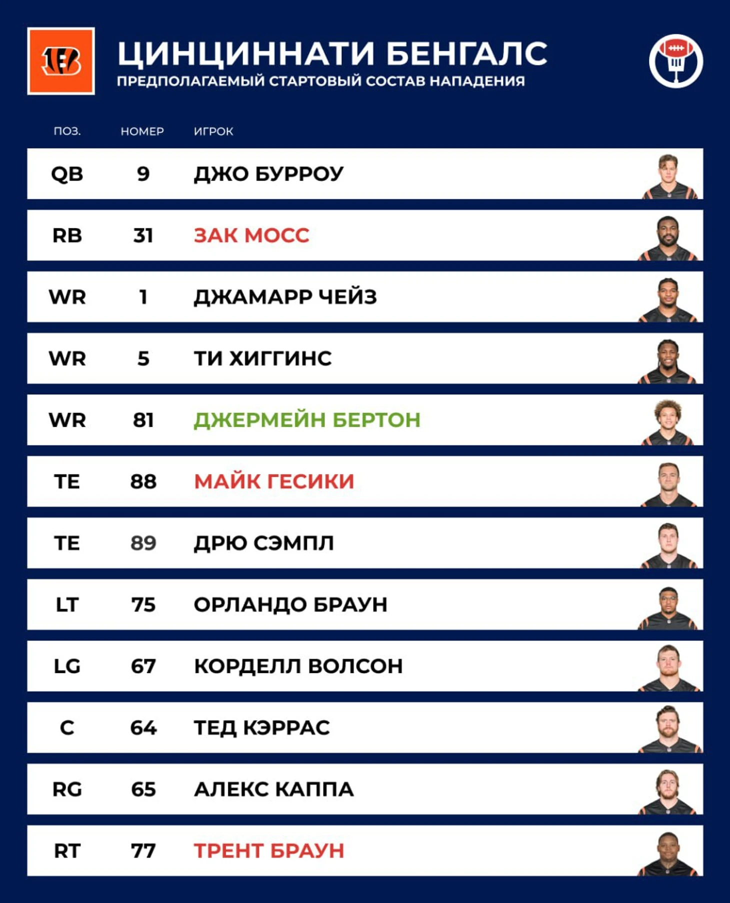 WR Джамарр Чейз — пятый номер драфта–2021, сходу зашёл в лигу как элитный ресивер: 3,700 ярдов за три сезона, три попадания в Матч звёзд. Играл с Бурроу в одном колледже.