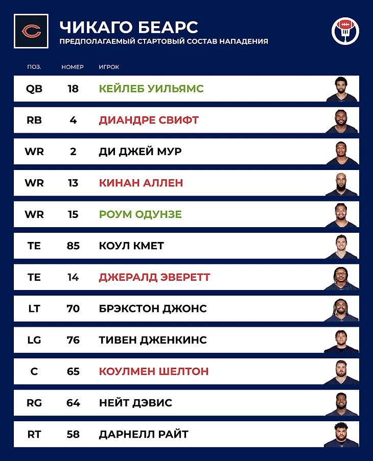 🎯 QB: Кейлеб Уильямс. История стара как мир: «Чикаго» пытается найти франчайз-квотербека. К концу прошлого сезона, когда стало понятно, что «Каролина» подарит «Чикаго» первый общий выбор на драфте, фан-база «Беарс» прошла через схизму — кейлебисты требовали начать всё заново на позиции QB, а свидетели Филдса говорили, что франчайз уже находится в команде. Победили первые. Кейлеб красиво и эффектно импровизирует на поле, но есть вопросы по характеру и умению играть в рамках системы.