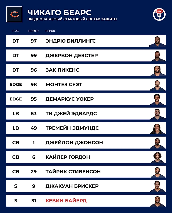 👔 Тренер: Мэтт Иберфлус. Его назначение в 2021 году было встречено с энтузиазмом на фоне доставшего болельщиков Мэтта Нэги. Полтора года болельщики ждали, когда специалист по защите наладит разболтанную оборону, в которой хватало индивидуально сильных футболистов. В первых 4 матчах прошлого сезона «Чикаго» пропускал в среднем по 34 очка, в последних 6 матчах — по 15.5 очка.