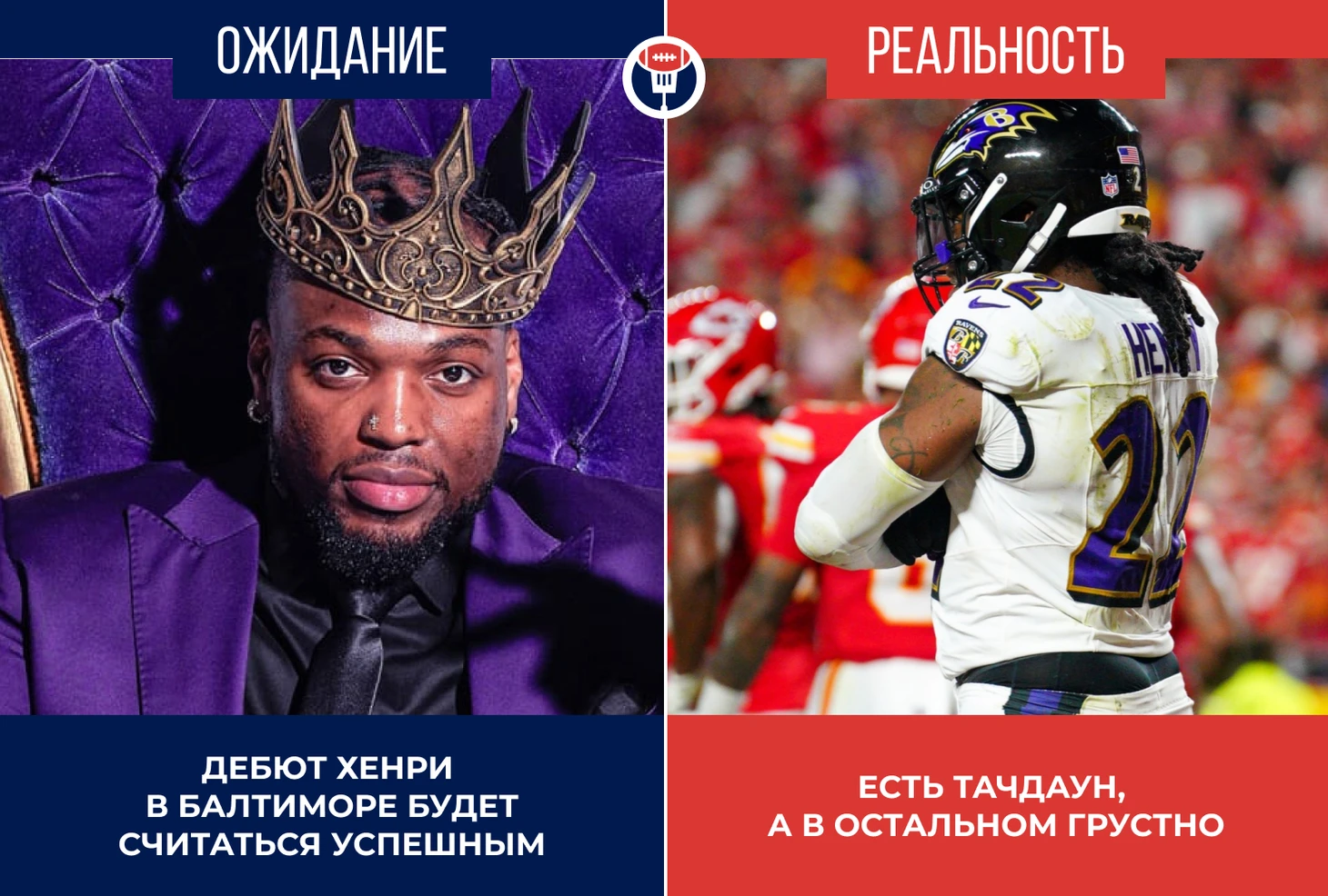 Первый драйв оказался единственным впечатляющим: 5 выносов и 5-ярдовый тачдаун. В дальнейшем до конца половины «Рейвенс» задействовали Хенри лишь три раза. В итоге его статистика выглядит скромно: 13 выносов на 46 ярдов с тачдауном.