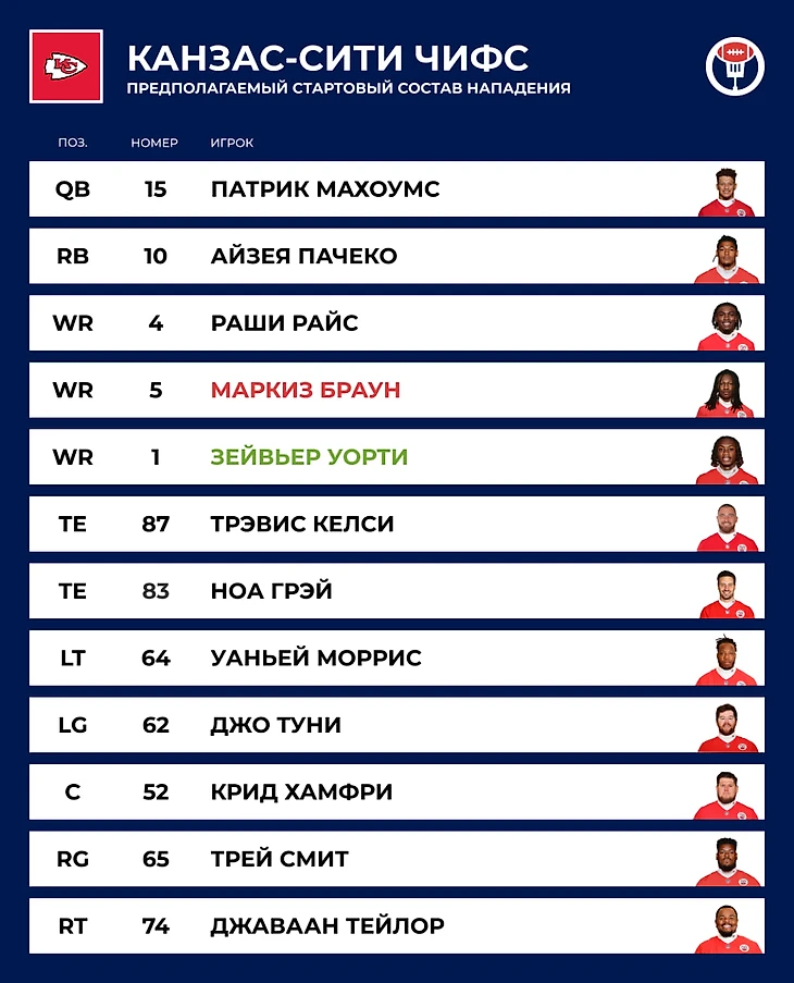 🤝 Находка: WR Зейвьер Уорти. Одна из главных проблем прошлого сезона — отсутствие адекватных принимающих у Махоумса. Только Раши Райс себя проявил, но и тот не добрался до тысячи ярдов. К нему на подмогу был подписан Голливуд Браун и задрафтован Уорти — хрупкий, но очень скоростной ресивер. Должен помочь вернуть «Чифс» вертикальную пасовую игру.