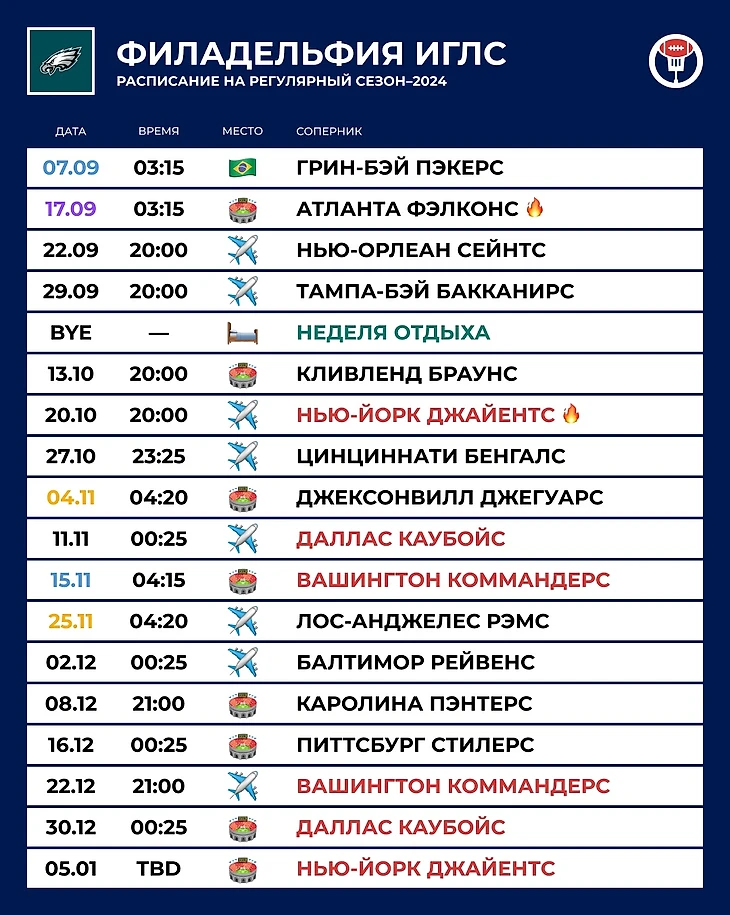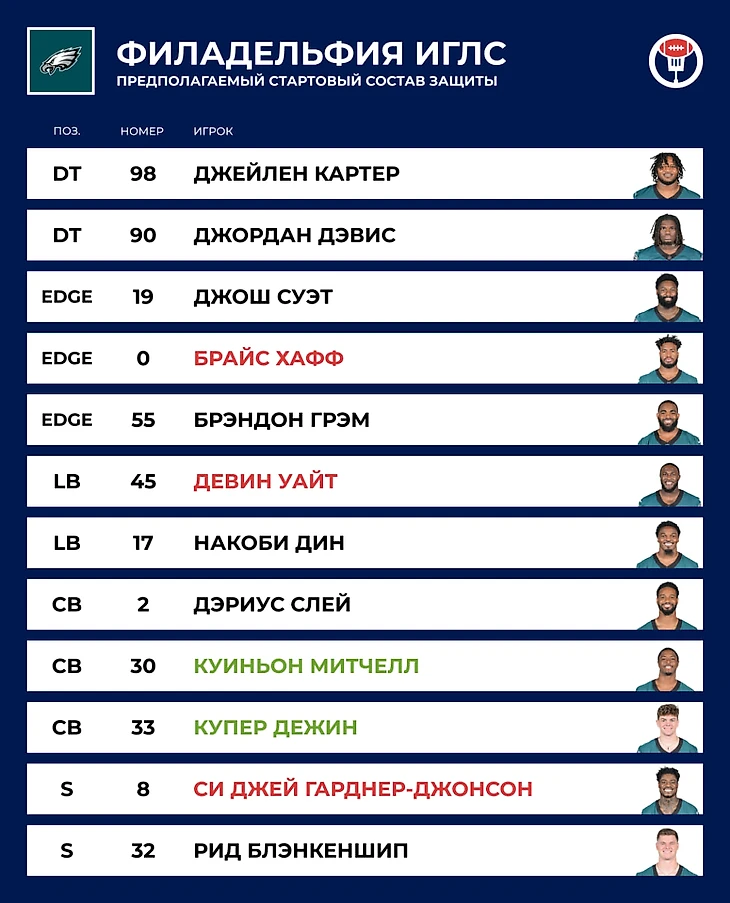🦶 Слабость: Текучка в тренерском штабе. Если состав сохраняется, то что сломалось в «Иглс» после проигранного Супербоула? Ушли оба координатора: Стайкен возглавил «Колтс», Гэннон — «Аризону». Их сменщики с задачей очевидно не справились. Теперь всё заново. На бумаге Келлен Мур и Вик Фанджио — специалисты с хорошим резюме. Но схематические изменения — это всегда головная боль.