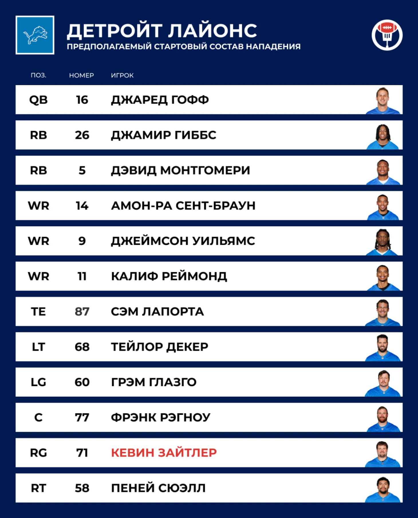 👋 Потеря: WR Джош Рейнолдс. В корпусе ресиверов «Лайонс» есть одна большая и яркая звезда по имени Солнце, а вот дальше... Джеймсон Уильямс пропустил весь дебютный сезон из-за травмы, а на второй лишь эпизодами показывал, за что его взяли в первом раунде. Рейнолдс был не суперэффективным, но надёжным. Этой надёжности будет не хватать.