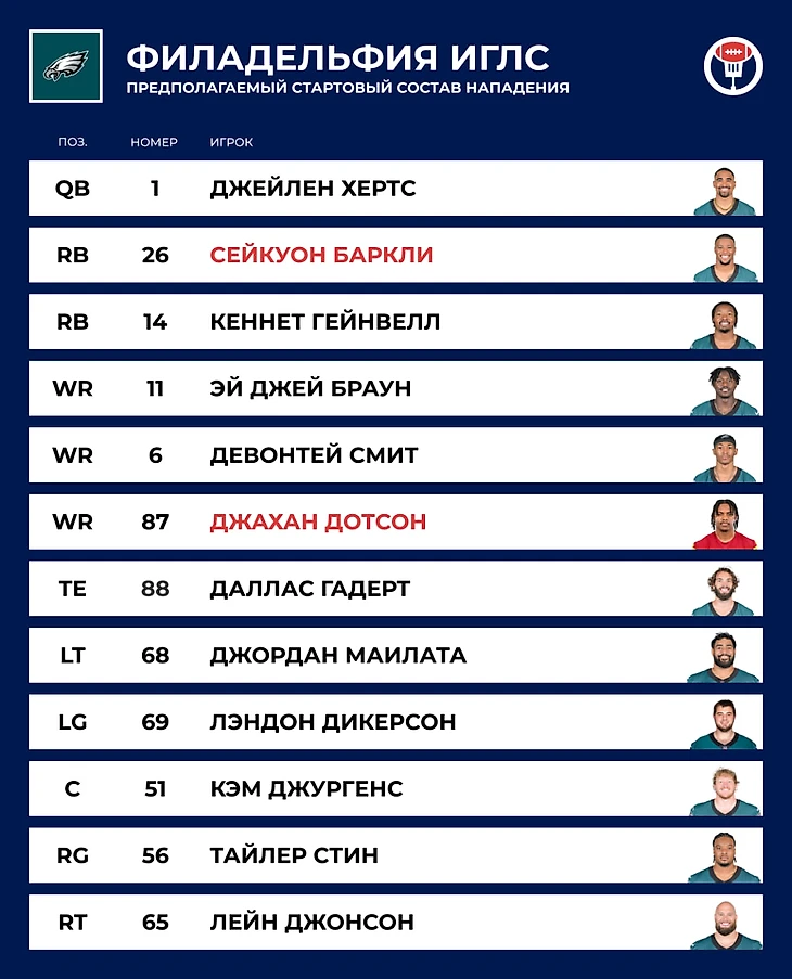 ⏪ Прошлый год: 11–6 и поражение в раунде уайлд-кард. Считались одними из главных фаворитов сезона после поражения в Супербоуле и долгое время оправдывали свой статус. К декабрю команда пришла с результатом 10–1, и хотя по игре было много вопросов (часто выигрывали на тоненького), все адвокаты команды предлагали посмотреть на табло. А с декабря началось свободное падение: «Иглс» проиграли 5 из 6 последних матчей регулярки (единственная победа — над «Джайентс» в одно владение) и без шансов влетели «Тампе» 9–32.