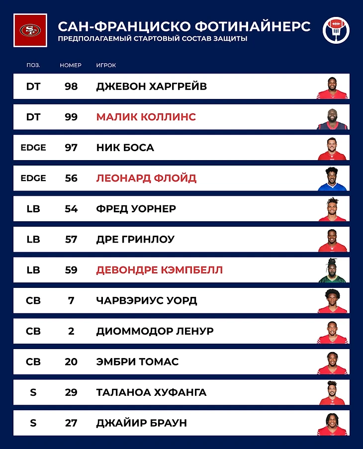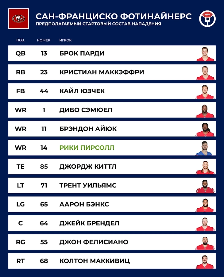 🦶 Слабость: Линия нападения. Наличие Трента Уильямса в составе создаёт впечатление об о-лайн «Сан-Франциско» будто она лучше, чем есть на самом деле. В Супербоуле Парди играл под давлением каждый второй дропбэк, и вообще опека паса — единственная плохая деталь в механизмах команды по оценке PFF. Так ещё и Уильямс пропустил всю предсезонку из-за разногласий по контракту.