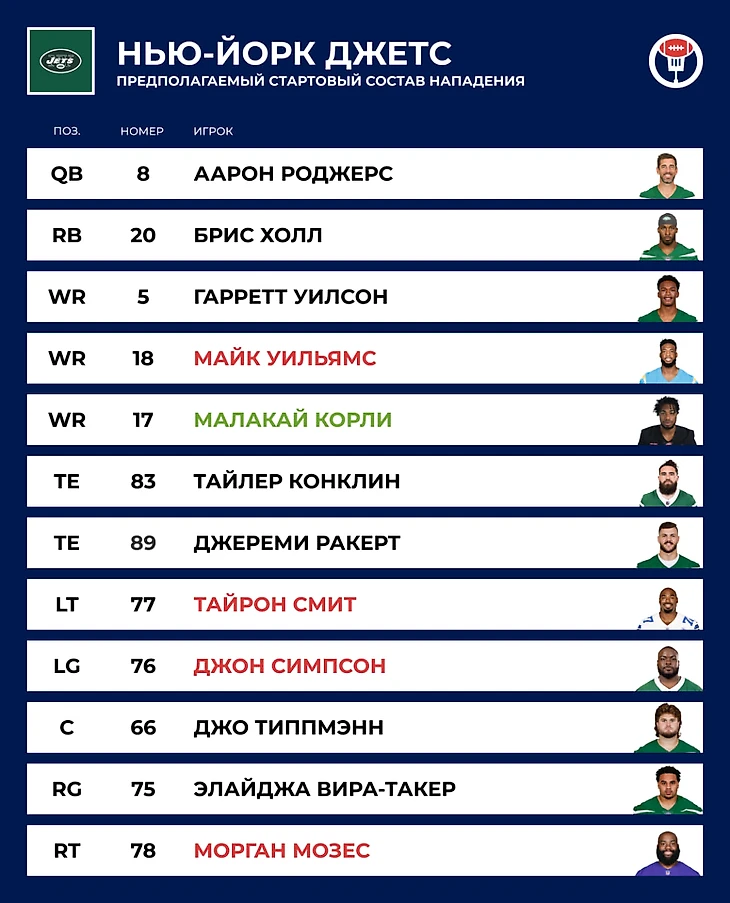🎯 QB: Аарон Роджерс. Четырёхкратный MVP лиги, который на склоне футбольных лет пытается завоевать второй чемпионский перстень за пределами ставшего родным Висконсина. Если брать карьеру целиком, то один из лучших квотербеков в XXI веке. Если брать сейчас, то это 40-летний эгоманьяк, который прошлый сезон пропустил целиком, а позапрошлый стал худшим в карьере.